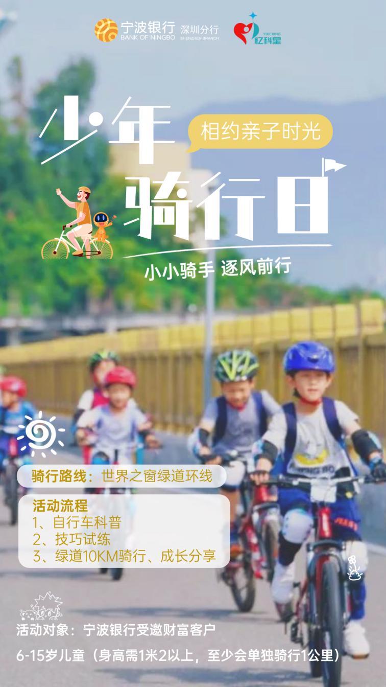 此次少年骑行活动,为客户提供了极佳的亲子活动体验,增强了客户对“财富有约”系列活动的认可。接下来,宁波银行深圳分行将搭建更多高质量、精品化的活动资源,为客户提供有温度、有深度、有高度的专业财富管理服务。