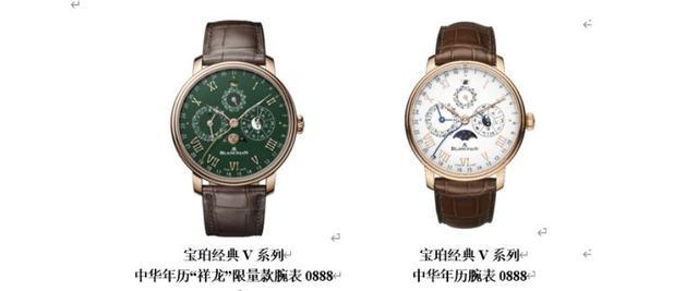 宝珀中华年历:由历法大师宝珀独创的中华年历腕表,首次让中西两套时间规则,同芯运转,是高级制表领域里程碑式的明星作品,更是高级制表领域百年来又一真正全新的原创大复杂功能。自问世以来,宝珀每年推出一款在摆陀上雕刻当年生肖的限量款,到2023年已集齐十二生肖版本。2024年,宝珀推出全新限量款中华年历腕表“贵绿金龙”。