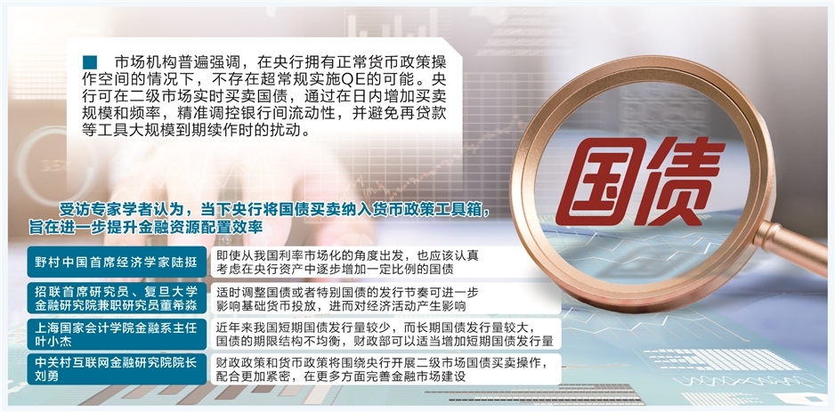 推进利率市场化改革、疏通货币政策传导机制是央行长期推进的任务之一。受访专家学者认为,当下央行将国债买卖纳入货币政策工具箱,旨在进一步提升金融资源配置效率。央行可以在二级市场实时买卖国债,通过在日内增加买卖规模和频率,精准调控银行间流动性,并避免再贷款等工具大规模到期续作时的扰动。
