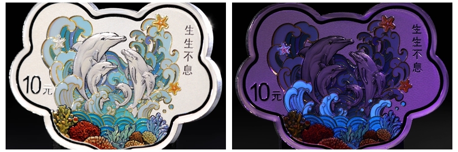在30克如意型银质纪念币工艺上,采用了光变临彩,彩色喷绘和全彩荧光油墨技术,以海豚一家五口,在海浪中欢快跃起的俏皮形象,呈现出家庭和谐欢乐的美好氛围,运用珊瑚等多种类海洋生物,也表达了海洋循环生生不息,绵延永存之意。