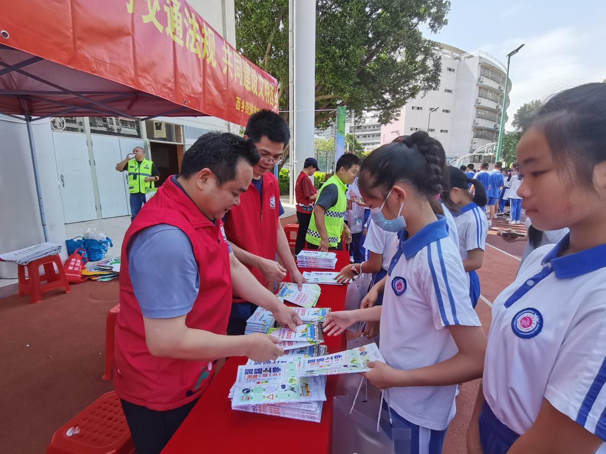 为进一步提高学生的交通安全意识,有效预防和减少涉校交通事故的发生,近日,流塘社区综治部门、团委、少工委联动西乡街道交安办、交警、流塘社区警区工作人员走进天骄小学开展交通安全进校园宣传活动,共筑安全防线,共建文明交通新风尚。