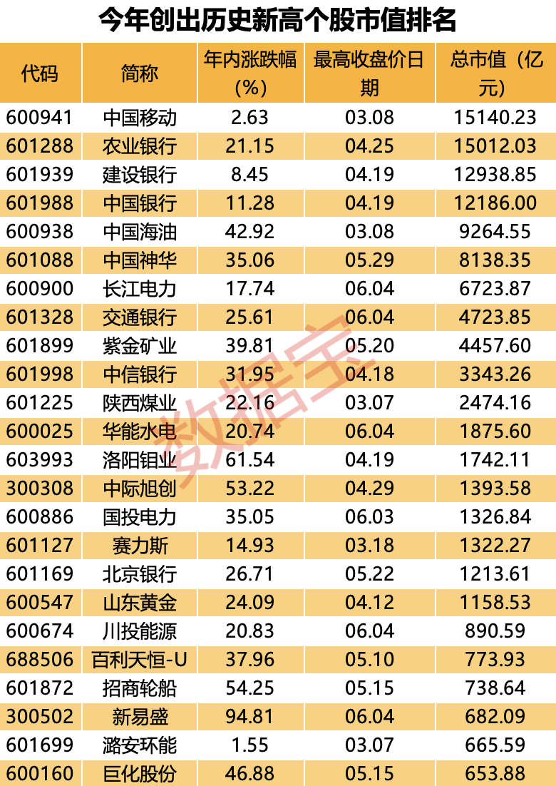 从市值角度来看,中国移动、农业银行、建设银行、中国银行4只万亿市值股票今年股价创出历史新高;此外还有中国海油、中国神华、长江电力等14只千亿市值股票也创出新高。