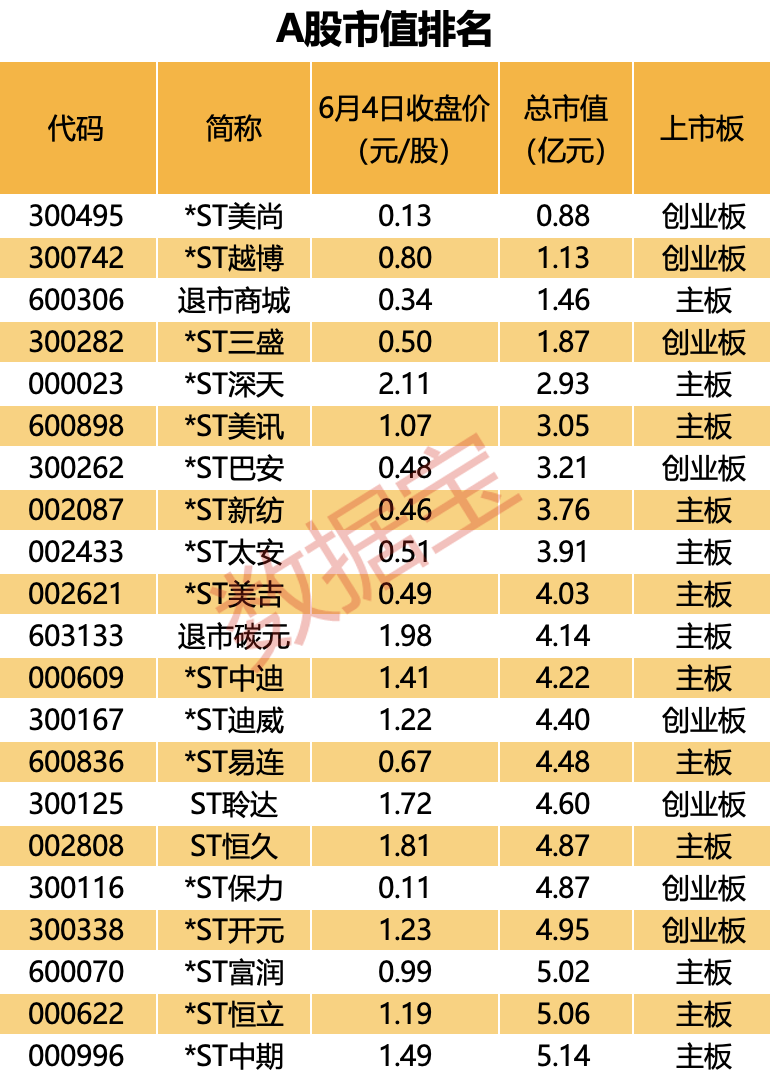 值得一提的是,目前还有20只个股市值低于5亿元。根据退市新规,主板A股(含A+B股)公司市值退市标准至5亿元;科创板、创业板公司市值标准不变,仍然为3亿元。这一退市新规将于2025年开始实施。