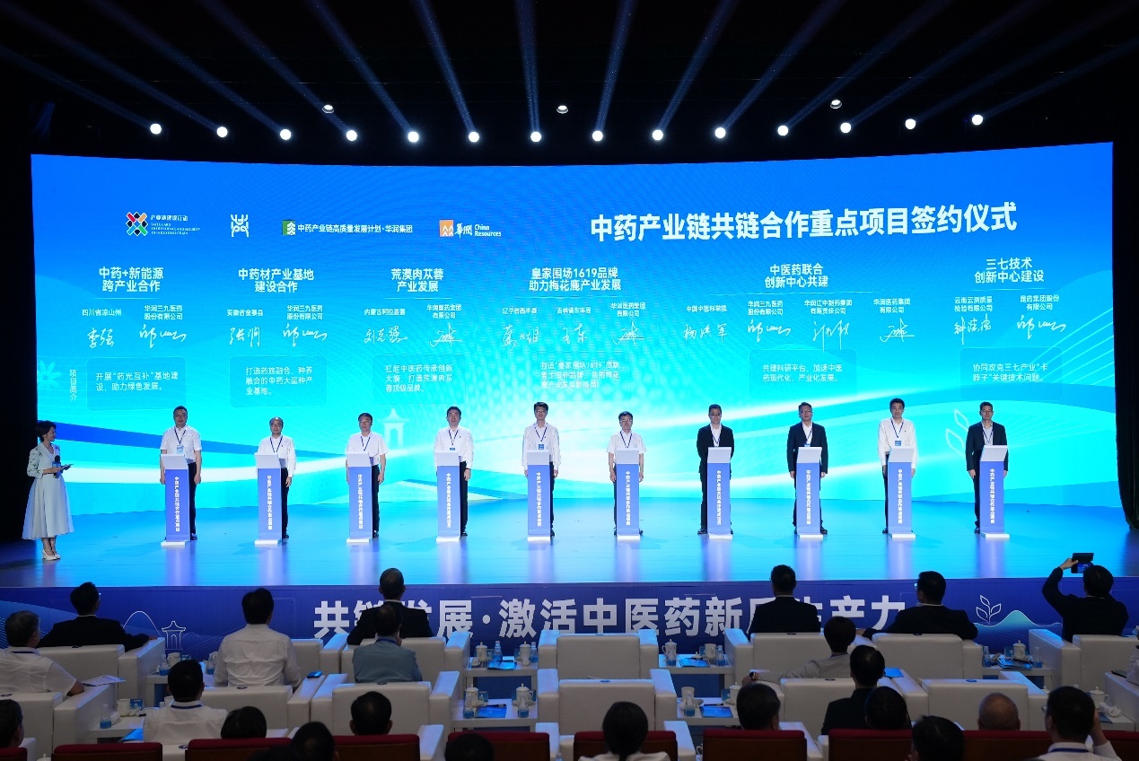 会上,华润集团发布了《华润集团中药产业链建设实践》和《中药产业链共链行动供需清单》,东阿阿胶健康消费品百亿产业园正式启动,“‘中药+新能源’跨产业合作”“中药材产业基地建设合作”“荒漠肉苁蓉产业”“皇家围场1619品牌助力梅花鹿产业发展”等多个产业链重大项目及多个产业赋能、协作配套以及资源共享类项目签约落地。达仁堂、漱玉平民、中国农业大学等产业链共链主体一同发起“中药产业链融通发展共链行动倡议”,倡导携手共建新机制、共筑新基础、共享新成果、共创新生态、共谋新发展。