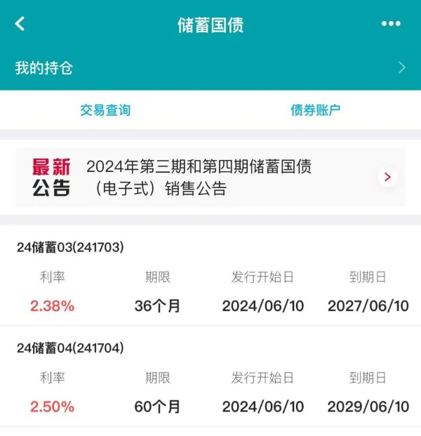 6月7日,农业银行等多家银行公告称,6月10日至19日,将售卖2024年第三期和第四期储蓄国债(电子式)。