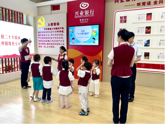 同日,兴业银行深圳华富支行也开展了“小小银行家”训练营活动。支行工作人员带领小朋友们参观了银行ATM区、对公柜台、现金柜台、理财室等各个业务区域,了解银行网点的基本运作。支行工作人员还为小朋友们讲解货币的起源,探讨如何创造管理财富等,小朋友们听得聚精会神,讨论得热火朝天。最后,工作人员为小朋友介绍了金融知识,讲授如何守护好钱袋子,帮助青少年金融消费者熟悉八项基本权益,切实维护好自身的合法权益。