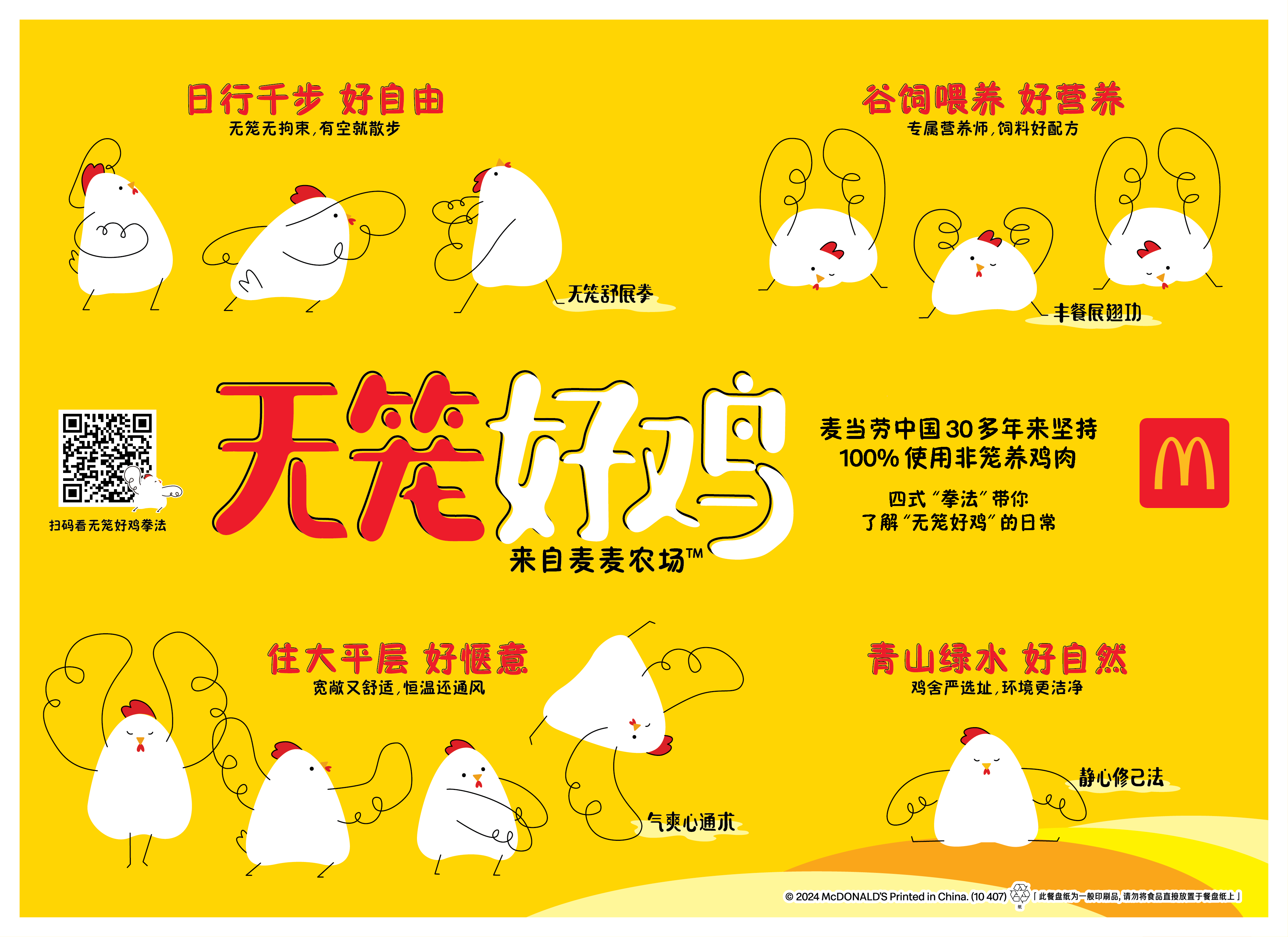 6月19日开始,“无笼好鸡”的标识将出现在麦当劳鸡肉当家产品的包装上,包括麦辣鸡腿堡、麦辣鸡翅、板烧鸡腿堡、麦麦脆汁鸡等,麦当劳中国线上点餐渠道也将同步上线“无笼好鸡”标识。麦当劳中国还为“无笼好鸡”设计了可爱的卡通形象,并以四招“无笼好鸡拳法”——“无笼舒展拳”、“静心修己法”、“气爽心通术”和“丰餐展翅功”生动讲述白羽鸡养殖过程中的非笼养殖、鸡舍选址、平层环境和谷饲喂养,该主题的限定餐盘垫纸在全国超过6000家麦当劳餐厅上线。消费者还可以下载使用“无笼好鸡”的同款微信表情包。