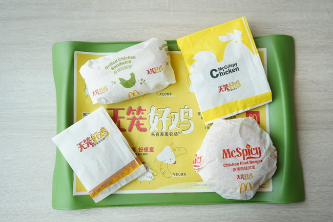 麦当劳鸡肉产品包装以及餐盘垫纸上的“无笼好鸡”标识