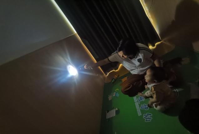(托小班的小朋友在上感统课) (乳儿班的小朋友在上光影课)