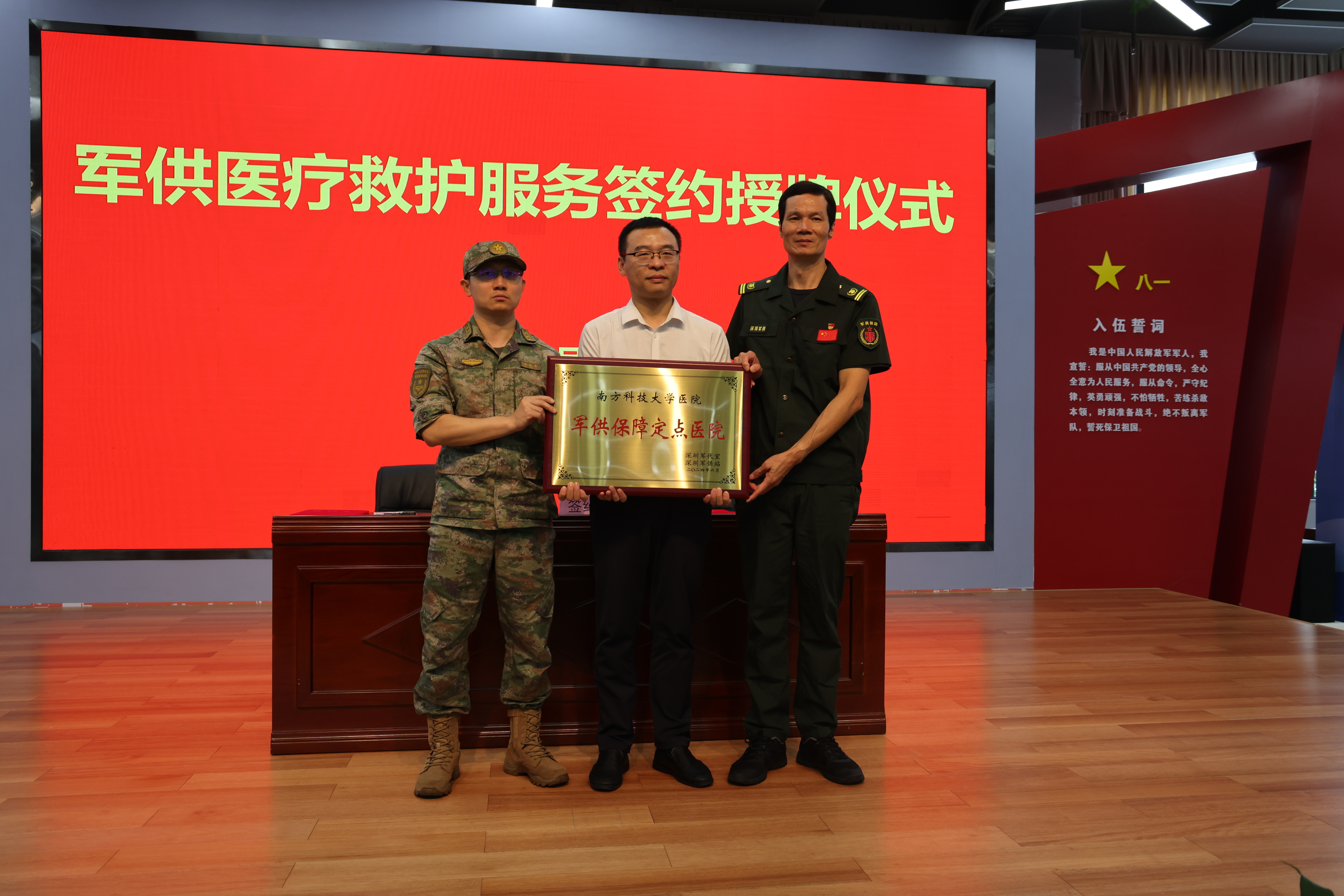 某军代室主任胡振翼和深圳军供站站长陈锦辉共同向南方科技大学医院授予军供保障定点医院牌匾。