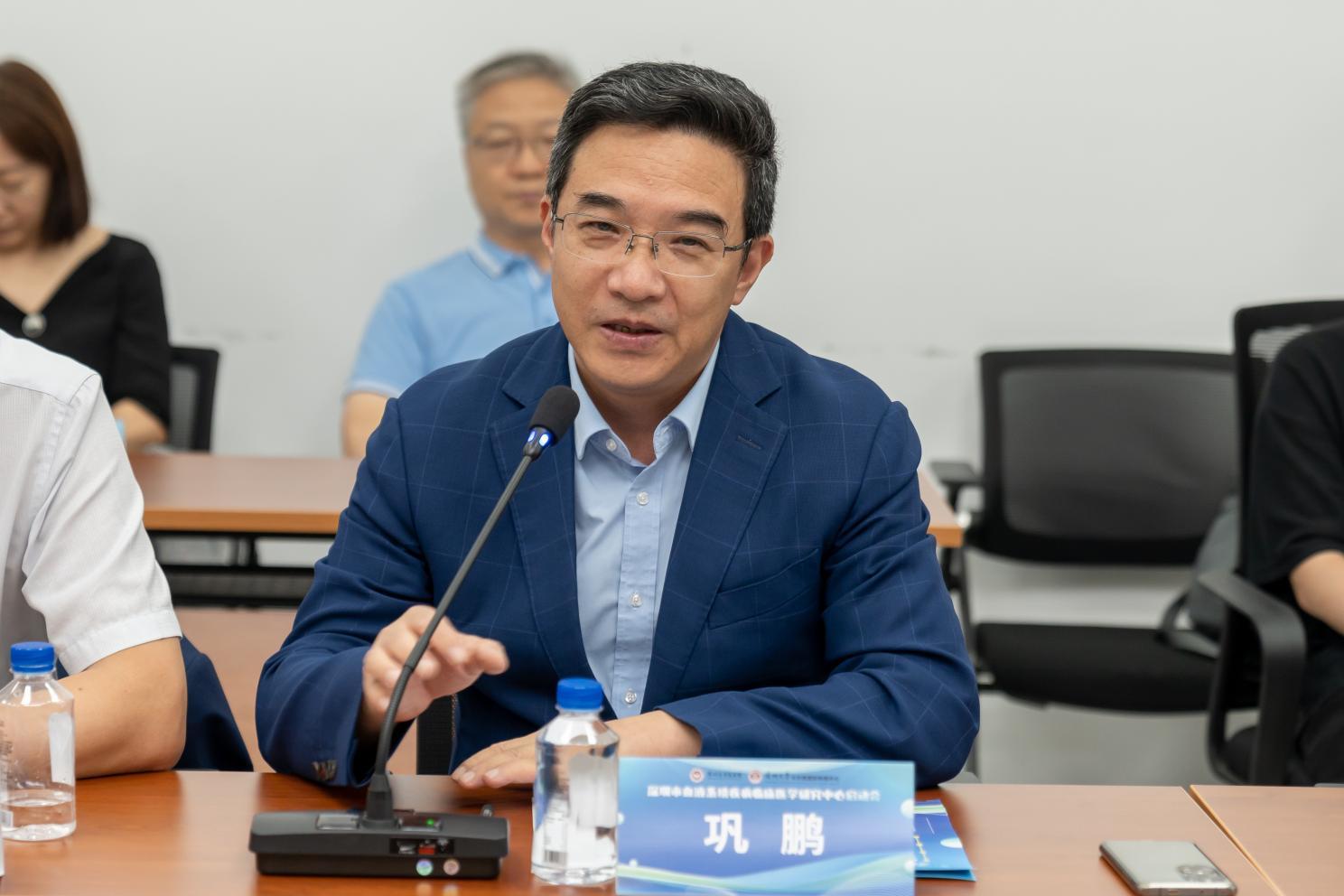 深圳大学总医院执行院长巩鹏首先致辞,代表中心的挂靠单位深圳大学总医院对中心申报期间得到上级有关单位和领导的大力支持和指导表示感谢。他表示,深圳大学总医院绝不辜负深圳市政府及深圳市科创委的信任,深圳大学总医院作为深圳市血液系统疾病临床医学研究中心负责单位,将高度重视本中心的建设发展,在平台建设、科学研究、人才建设等方面持续给予大力支持,保障中心顺利建立,更好造福深圳市民。