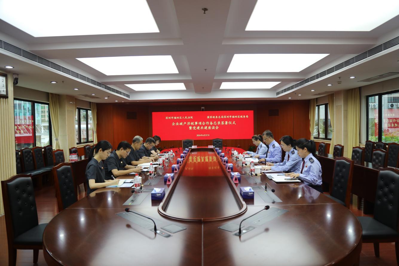 会议由福田法院党组成员、副院长周鹏盛主持,福田法院党组书记、院长王德军,福田区税务局党委书记、局长、督办孙国应,党委委员、总经济师段莹出席会议,福田法院、福田区税务局相关负责同志参加会议。