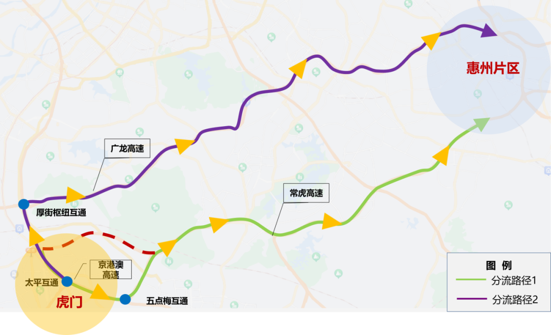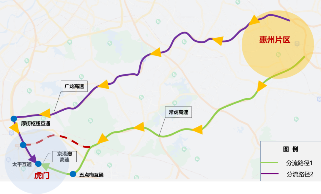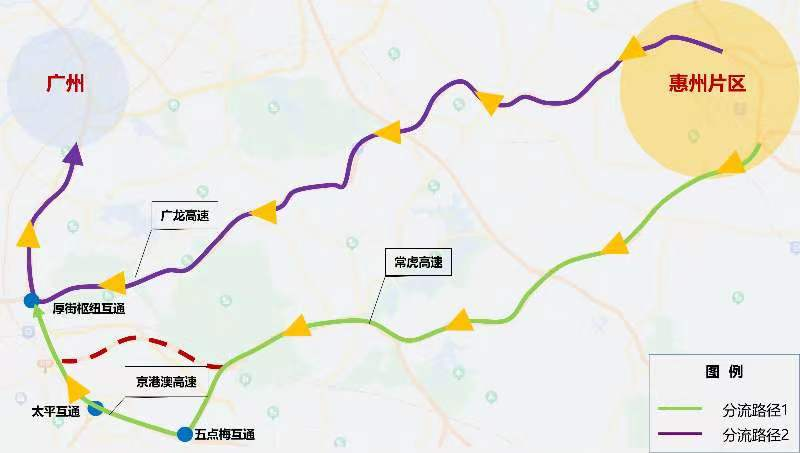 路线一:太平互通—京港澳高速—五点梅互通—常虎高速五点梅支线—常虎高速主线—惠州
