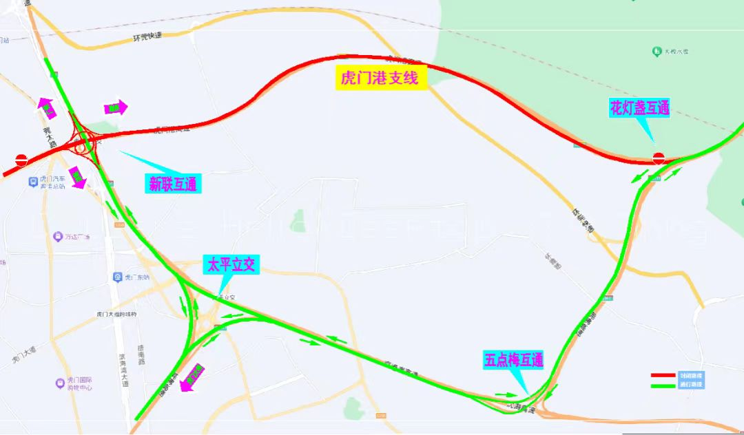 封闭区段自花灯盏互通起,跨越京港澳高速主线后,止于虎门北收费站。
