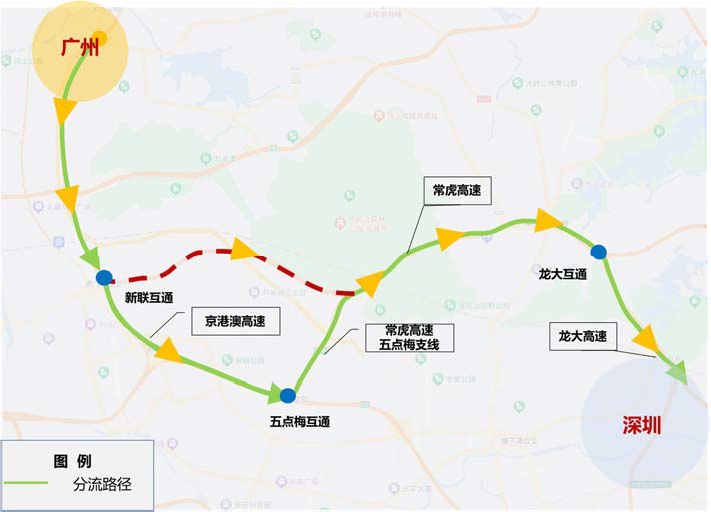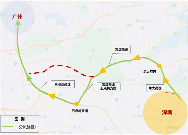 京港澳高速—五点梅互通—常虎高速五点梅支线—常虎高速—龙大互通—龙大高速—深圳