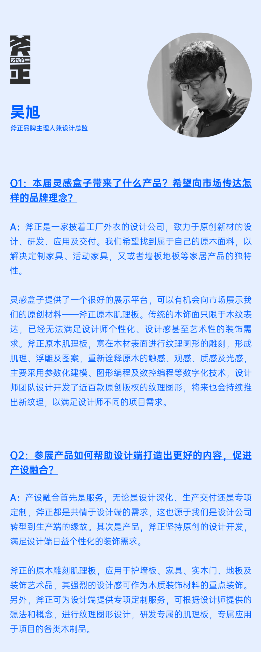 「灵感盒子」材料特展现场上,全方位展现了中国产设融合的独特魅力和活力。展览通过先锋设计和优质产业的集群互动推动行业交流融合、聚拢多源流量,共同打造新质生产力。跟随策展团队和领跑品牌的分享,一览那些启迪灵感的精彩瞬间与论坛中激荡的智慧火花。