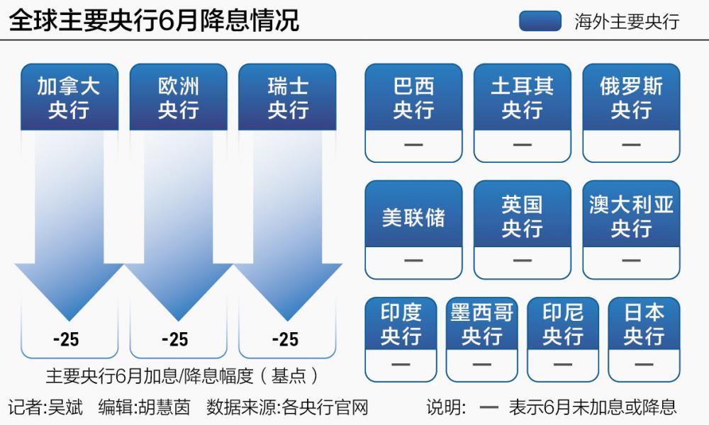过去一个月,加拿大央行打响G7(七国集团)降息第一枪,欧洲央行也紧随其后,瑞士央行更是意外连续两次降息。与此同时,美联储、英国央行、日本央行、澳大利亚央行、巴西央行、土耳其央行、俄罗斯央行、印度央行、印尼央行则暂时按兵不动。