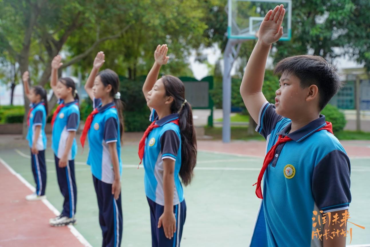 活动第一天,来自深圳的学生参加了百色希望小学的升旗仪式,迎接清晨第一缕阳光。