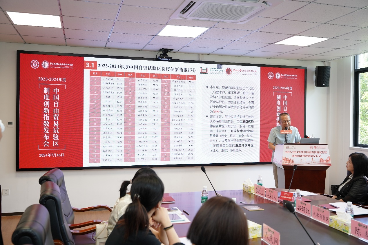 中山大学自贸区综合研究院院长符正平教授代表课题组介绍了“2023至2024年度中国自由贸易试验区制度创新指数”相关情况。围绕“贸易便利化”、“投资自由化”、“金融改革创新”、“政府职能转变”与“法治化环境”五大维度开展指标体系设计、数据收集整理和评价指数测度工作,从而对当前自贸试验区制度改革与创新的成效进行系统性、深层次和多视角的检视与考察。