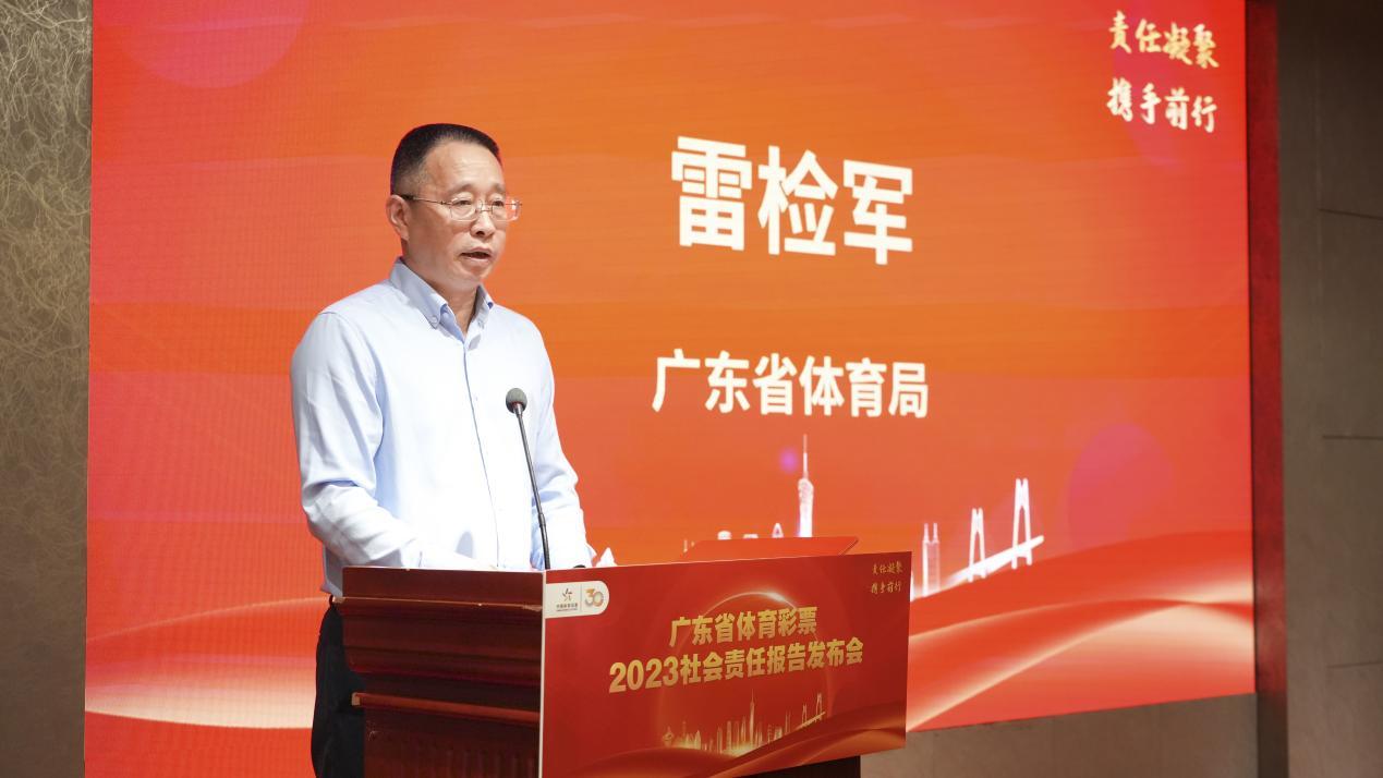 “2023年,广东体彩坚守国家公益彩票的责任担当,忠诚履行使命任务,推动体育彩票高质量发展迈上新台阶、取得新成效,体现了新时代新征程广东体育事业发展的新气象,展现了广东体育敢为人先、勇立潮头的拼搏精神。”广东省体育局副厅级干部雷检军对广东体彩为体育事业作出的贡献及责任彩票建设方面取得的成效表示充分肯定,并结合广东在全国大局中肩负的使命任务,要求全省体彩系统总结好体育彩票发展经验,继承并发扬好中华体育精神,守正创新激发市场活力,用高水平安全护航高质量发展,同时进一步融入体育发展大局,积极支持打造更多贴近群众、服务社会的体育彩票公益品牌。