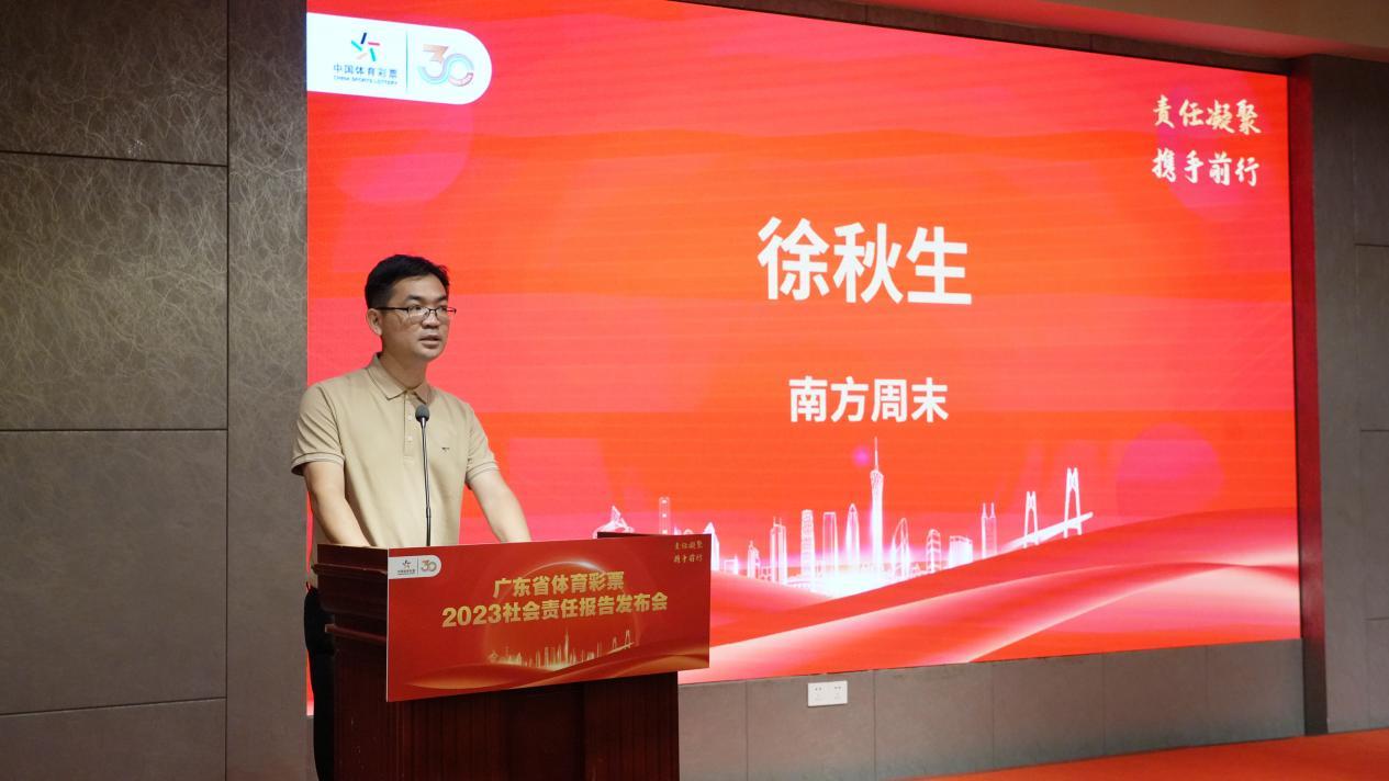 立足多年深耕社会责任发展领域、积极推动社会责任这一课题在中国的实践与发展,南方周末副总经理徐秋生对《广东省体育彩票2023社会责任报告》进行点评。他表示,《报告》全面、深入、透明,充分展示了广东省体育彩票在履行社会责任、推动责任彩票建设方面的坚定决心和实际行动,切实回应了内外部利益相关方的关注议题,不仅为公众了解广东省体育彩票的社会责任工作提供了重要参考,也为其他地区和行业的社会责任工作提供了有益借鉴和启示。