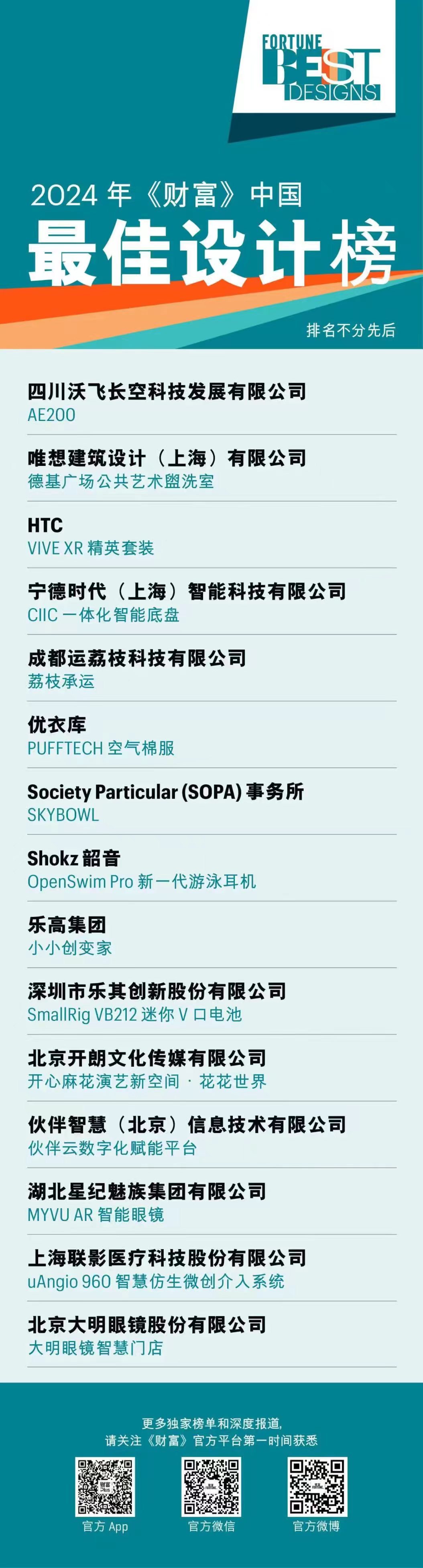 对于本次评选,《财富》杂志相关负责人表示,本次是我们连续第三年评选《财富》中国最佳设计榜,不同于传统的设计评选仅着眼于外观和美学, 本次我们评选出的50个最佳设计项目,或是推动了商业模式的进化,或是重新定义了产品品类,其中一部分正在成为新产业、新趋势价值链的起点,从0到1创造着全新的商业赛道。在经历了数十年的产业积累后,中国制造在全球价值链上的地位正迅速攀升,我们希望以此份最佳设计榜单见证“中国制造”向“中国创造”的蜕变与跃升,也希望这些创新设计背后折射的社会和商业趋势能为公众带来启发。