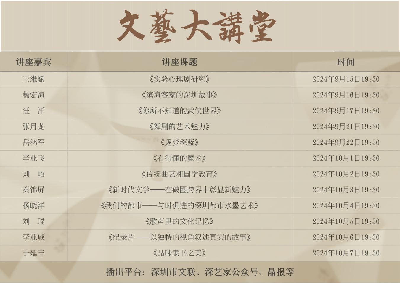 在2024年文艺大讲堂系列课程中,12位文艺名家充分发挥所长,向广大市民及艺术爱好者们分享自身艺术历程、创作经验及心得体会。如市民协杨宏海的《滨海客家的深圳故事》,介绍深圳“滨海客家”这一族群产生的历史背景,从九龙海战、庚子首义等近代6大历史事件切入,讲述客家代表人物故事,解读“开拓、进取、包容、重商”的客家文化;杂协辛亚飞的《看得懂的魔术》,揭晓魔术背后的秘密,探讨传统现代魔术艺术的融合变革和推陈出新,促看魔术、学魔术、议魔术成为一种时尚;影视协李亚威的《纪录片——以独特的视觉叙述真实的故事》,揭秘从生活真实到艺术真实的纪录片的诞生过程,及如何从平凡的日常里筛出艺术金屑。此外,舞协张月龙将诠释《舞剧的艺术魅力》;摄协岳鸿军分享《逐梦深蓝》的水下摄影历程及收获;书协于延丰带领大家《品味隶书之美》;美协杨晓洋将讲述《我们的都市——与时俱进的深圳都市水墨艺术》;剧协王维斌将带领大家开展《实验心理剧研究》。