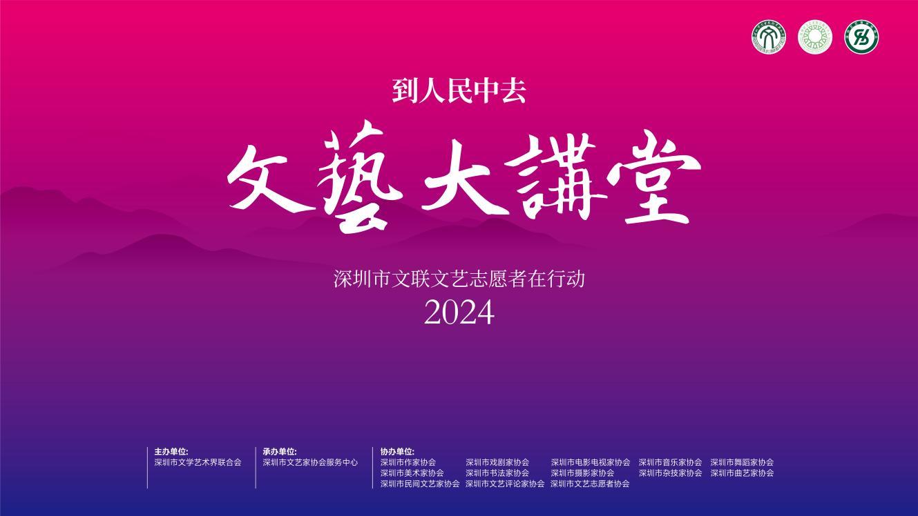以文化艺术之美浸润心灵、滋养城市,不断激发市民群众的文艺创新创造活力。近日,由深圳市文学艺术界联合会主办,深圳市文艺家协会服务中心承办,深圳市作协、剧协、影视协、音协、舞协、美协、书协、摄协、曲协、杂协、民协、评协等12个文艺家协会及市文艺志愿者协会联合协办的深圳市文联文艺志愿者在行动(2024)——“到人民中去”文艺大讲堂即将在“云端”开讲。