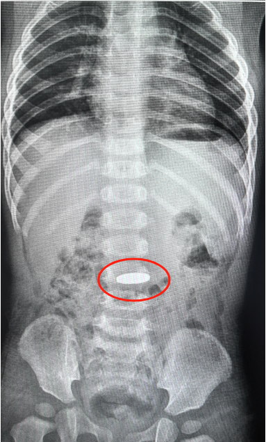 日前,一岁4个月的强强(化名),在家里拿着一枚一毛钱的硬币玩。强强爸爸担心孩子误吞,就将硬币放进空矿泉水瓶里边给孩子玩。谁料强强一把抓住水瓶就学大人喝水的动作,咕咚!家长还来不及抢,就看着强强将一毛钱吞了进去。孩子的家长立即带强强来到了深圳大学附属华南医院急诊科。经过CT检查,医生在强强的胃里确实发现了一个一毛钱硬币大小的阴影物。急诊医生告诉强强爸妈先不用着急,小孩误吞异物比较常见,强强误食的是一毛硬币大小的圆形异物,而且在胃部,建议他们先回去观察两三天,看孩子是否可以自行排出来。