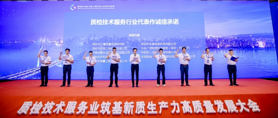 为提倡和践行诚信经营理念,在深圳市计量质量检测院刘铁东院长的带领下,华测检测认证集团股份有限公司等九家质检技术服务机构代表上台举拳宣誓,宣读诚信经营承诺书,向全市经营主体发出诚信经营倡议,积极打造诚实守信的营商环境。