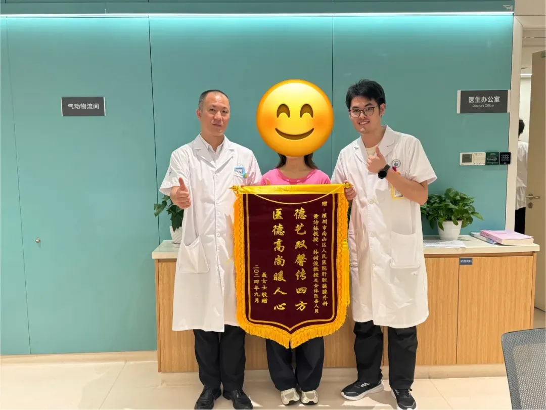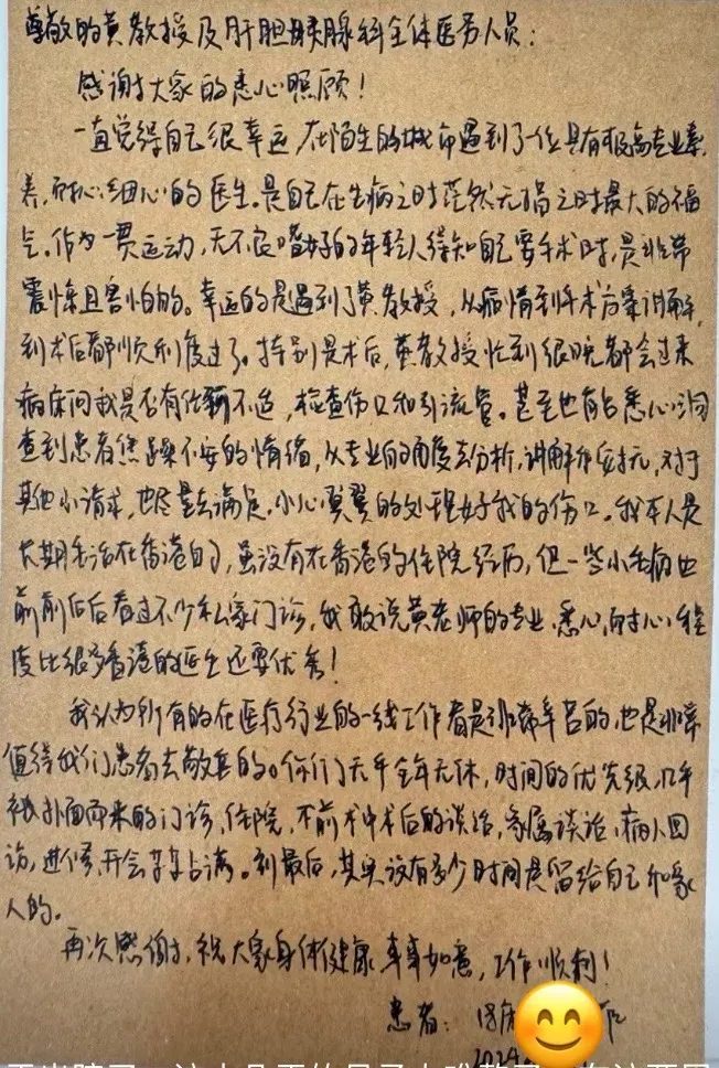 这次成功的微创手术,不仅让患者恢复了健康,更为香港患者前往深圳就医提供了一个重要的参考范例。患者对此次手术的结果和南山医院的专业服务十分满意。出院当天,患者特意送上锦旗,并附上了一封亲手书写的感谢信。信中,患者动情地写道:“感谢黄诗栋医师和南山医院肝胆胰外科医护团队的细心照料,您的专业和关怀让我在异地也感受到了家的温暖。这次手术不仅消除了我身体上的疾病,更让我对未来充满了信心。”她还在信中赞扬了南山医院团队的高效沟通和贴心护理服务,称这些细节让她感受到了真正的国际标准医疗体验。