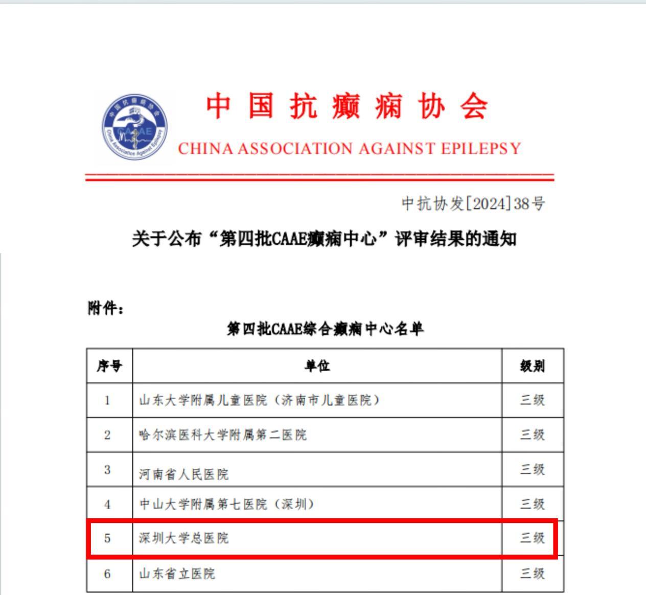 10月9日,中国抗癫痫协会官网公布了第四批CAAE癫痫评审结果,深圳大学总医院癫痫中心正式通过“国家三级综合癫痫中心”评审,成为广东省第四家取得“国家三级综合癫痫中心”认证的医院。此次评审通过,是中国抗癫痫协会对深圳大学总医院癫痫中心综合诊疗实力的高度肯定,标志着深大总医院癫痫中心已迈入国家第一梯队。