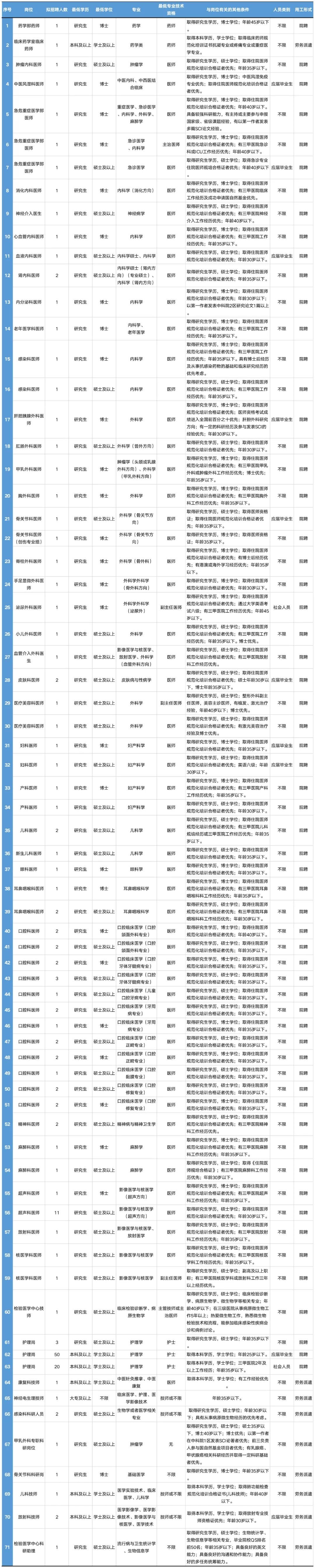 截至2024年9月30日,全院共有院聘职工2404人,其中专业技术人员2122人。其中博士研究生170人(博士后26人)、硕士研究生567人,高级职称人员共568人(正高174人、副高394人),博士研究生导师10人、硕士研究生导师101人。医院拥有国家临床重点专科、省市区重点专科共19个;引进市、区、院级三名工程团队10个(其中院士团队3个);拥有国家外国高端专家、享受国务院特殊津贴专家等一大批高层次医疗卫生人才和临床实用型人才。
