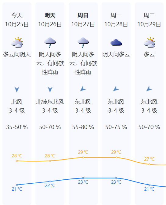 26-27日 阴天间多云,有间歇性阵雨,其中26日最大阵风9级左右。