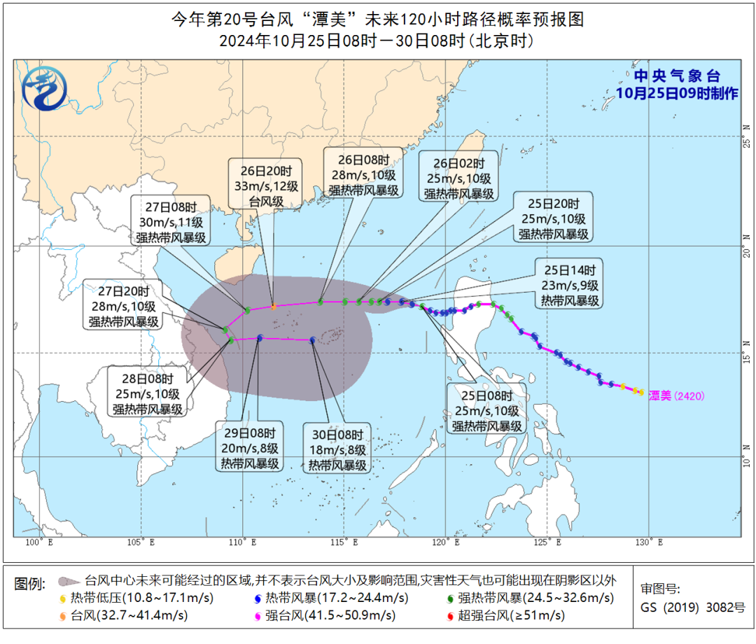 深圳市气象台2024年10月25日08时发布全市台风白色预警信号,台风“潭美”已进入我市800公里防御圈,将趋向南海中部海域。