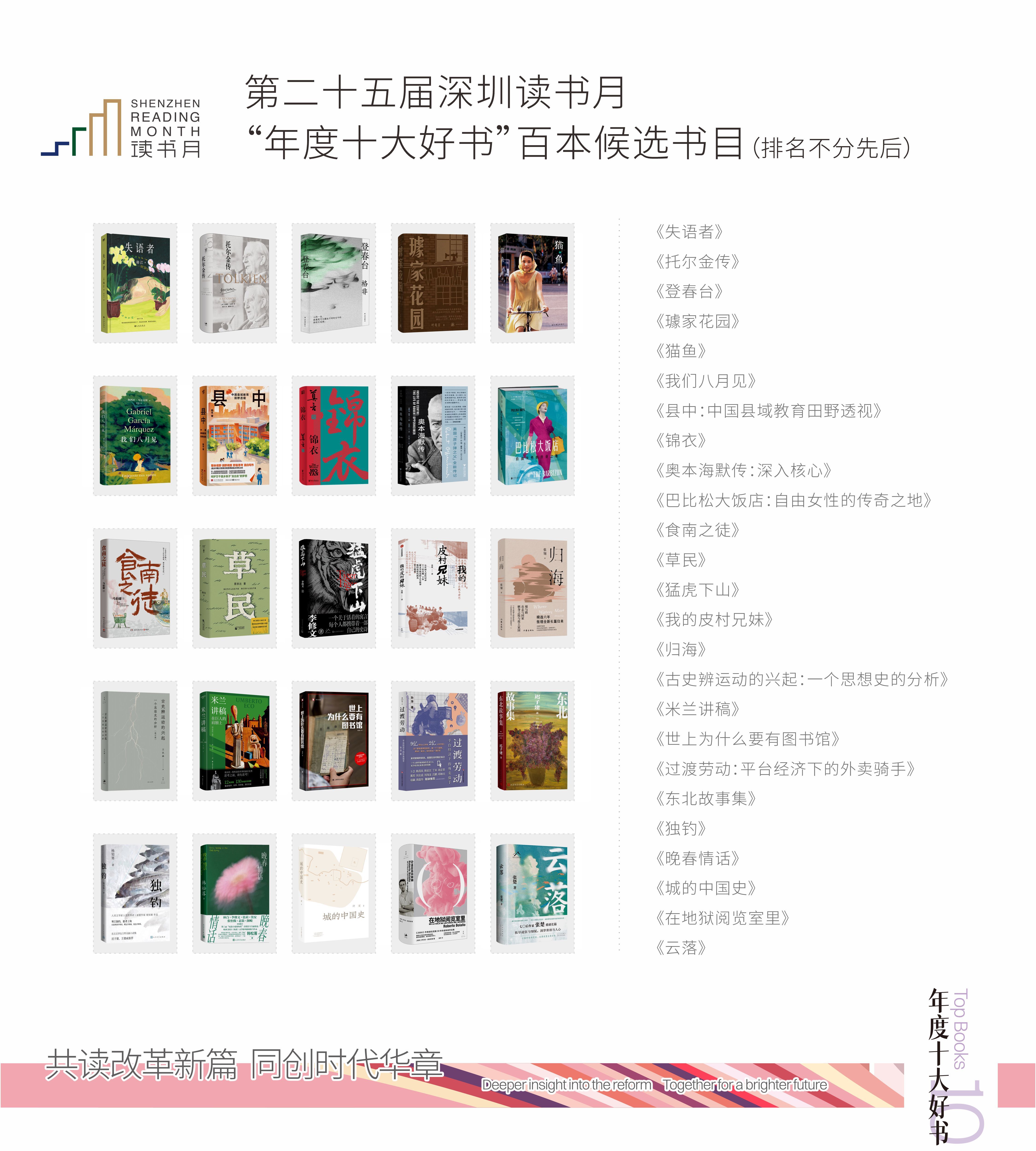 随着第二十五届深圳读书月临近,备受期待的经典品牌活动——“年度十大好书”评选已经拉开帷幕。日前,本届深圳读书月“年度十大好书”100本候选书目正式出炉,《过渡劳动:平台经济下的外卖骑手》《大地上的家乡》《福柯传》《去家访:我的二本学生2》等中外作家的虚构及非虚构佳作入选,涵盖文学、历史、哲学、文化、艺术等人文社科领域。最终评选结果将于11月深圳读书月期间揭晓。