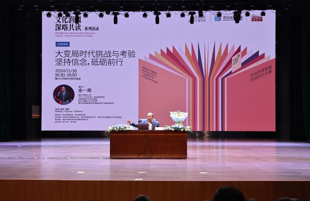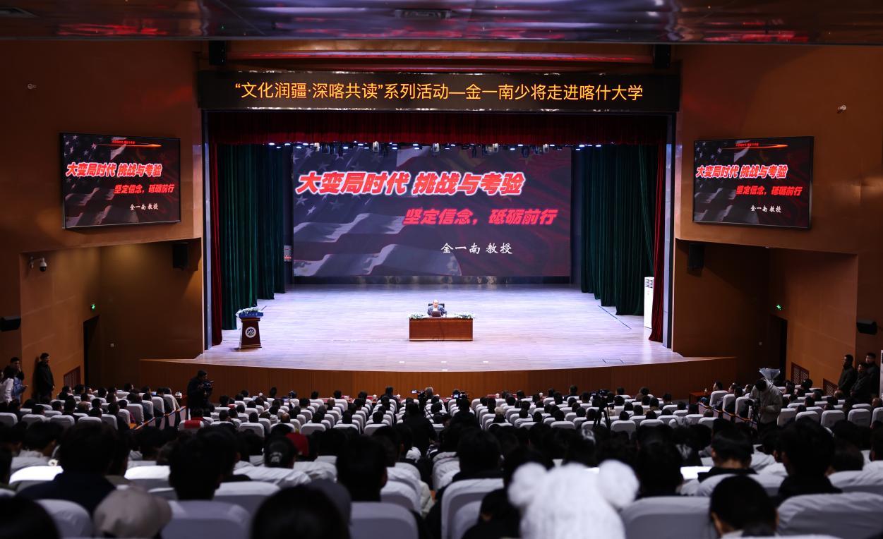 11月16日下午,第二十五届深圳读书月“文化润疆·深喀共读”系列活动诚邀金一南少将走进喀什大学带来主题讲座《大变局时代挑战与考验,坚持信念,砥砺前行》,现场1300多名干部、市民、师生、官兵等共同聆听了这场精彩的讲演。金一南少将以独特的战略思维和精辟论述为现场听众带来了一场思想上的深刻启迪。喀什地委副书记、深圳援疆前指总指挥谢海生,喀什地区行署副专员张建国出席活动,喀什大学党委书记丁邦文主持活动。