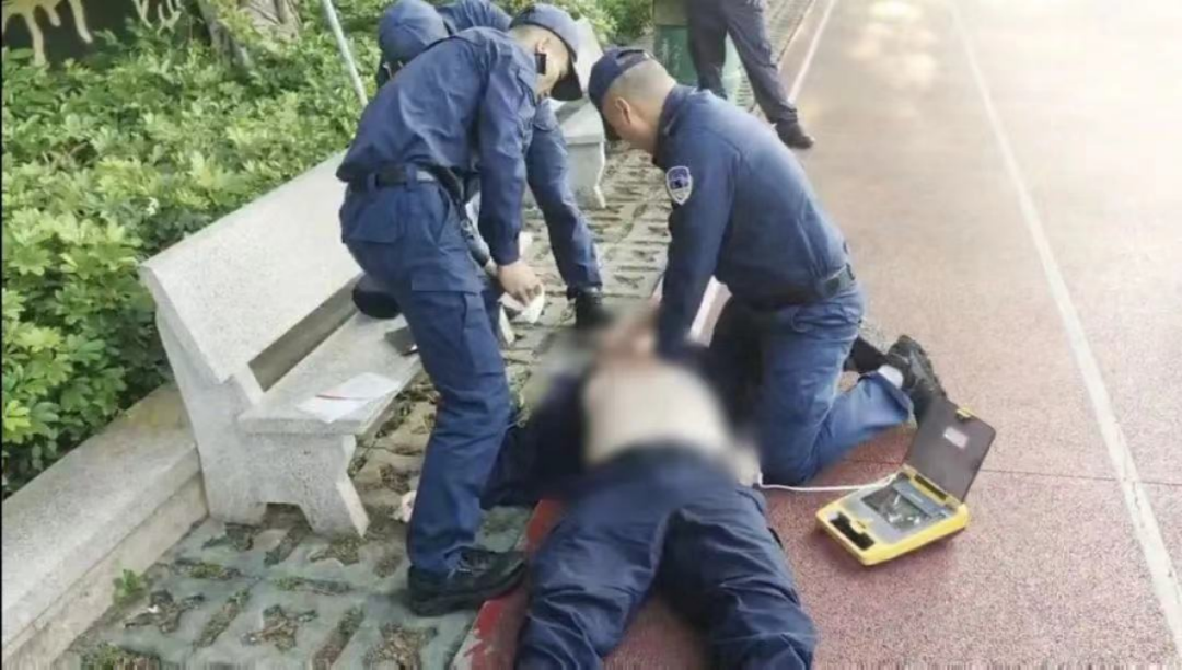 2024年3月20日早上,林嘉雄正在开展学员早操培训。7点19分许,一名学员因为突感胸闷不适坐在操场边的凳子上休息,不一会儿突然晕厥倒地。林嘉雄发现后立即上前查看,他发现该学员失去意识,拍打其肩膀没有应答,呼吸明显不正常,林嘉雄立刻作出判断,此人可能已经发生心脏骤停,必须对该学员进行心肺复苏。