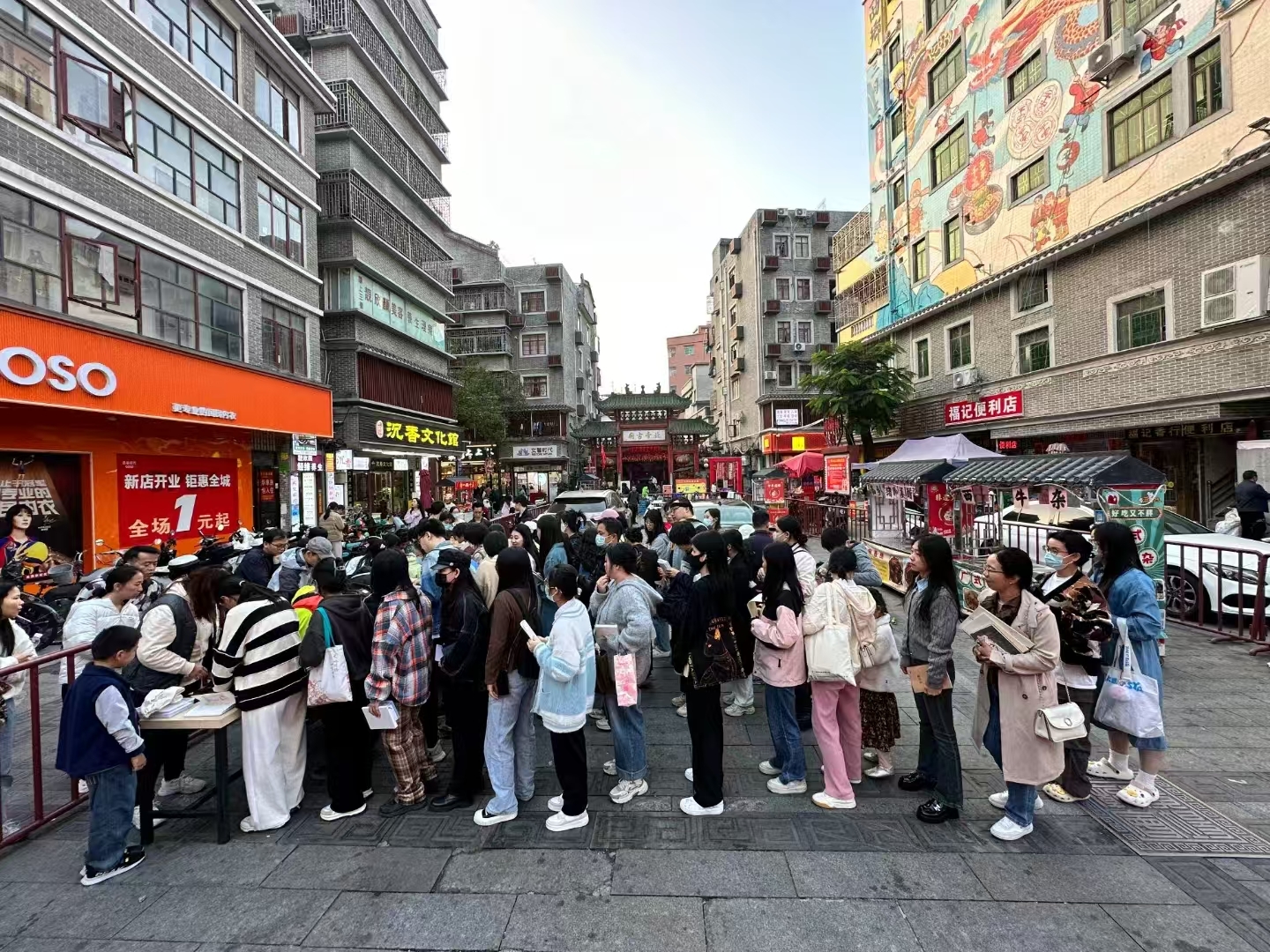 “大家可以观察到每个集章点位我都策划设置在商铺门店前。我作为西乡文体的工作人员,也希望通过策划这场活动带旺这条街区,助力打造西乡特色文化旅游街区。打造西乡北帝三月三庙会特色文旅,也是西乡街道的愿景。西乡北帝三月三庙会已经成为深圳市的一大民俗品牌,庙会经济能持续焕新活力,在这座街区如能再现西乡百年前商业繁盛之景,是我们共同的美好愿景。这座牌坊上写的庙街,是西乡北帝古庙黄镇光会长特意打造,是我们相关工作推动者创办西乡特色文旅街区迈出的重要一步。我邀请深圳印章青年设计师陈镇涛发起这场以深圳为主场,遍邀大湾区城市东莞、广州、佛山、中山、汕头、泉州,还有北京的文创印章设计者朋友们来到深圳,不能到场的朋友也把他们的印章邮寄过来表示支持,是因为他们觉得这场公益性文化交流活动将有深远的影响力和不可估量的潜在经济价值。传统与新潮,都是传承传统文化的形式,我们希望无论是老人还是小孩,我们将来的文化活动策划尽量做到人人喜爱,没有门槛,这样我们在传承文化方面就绝不会断代。”策划人徐浩浩向记者说道。