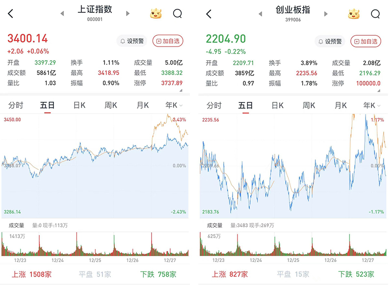 A股三大股指12月27日开盘涨跌互现。盘初两市窄幅震荡,午前出现一波急涨,深成指和创指均一度涨超1%。午后两市震荡下行,深成指和创指尾盘转跌。