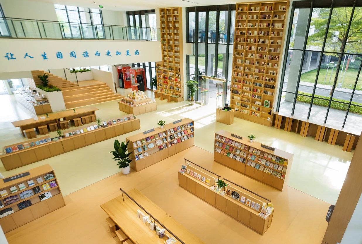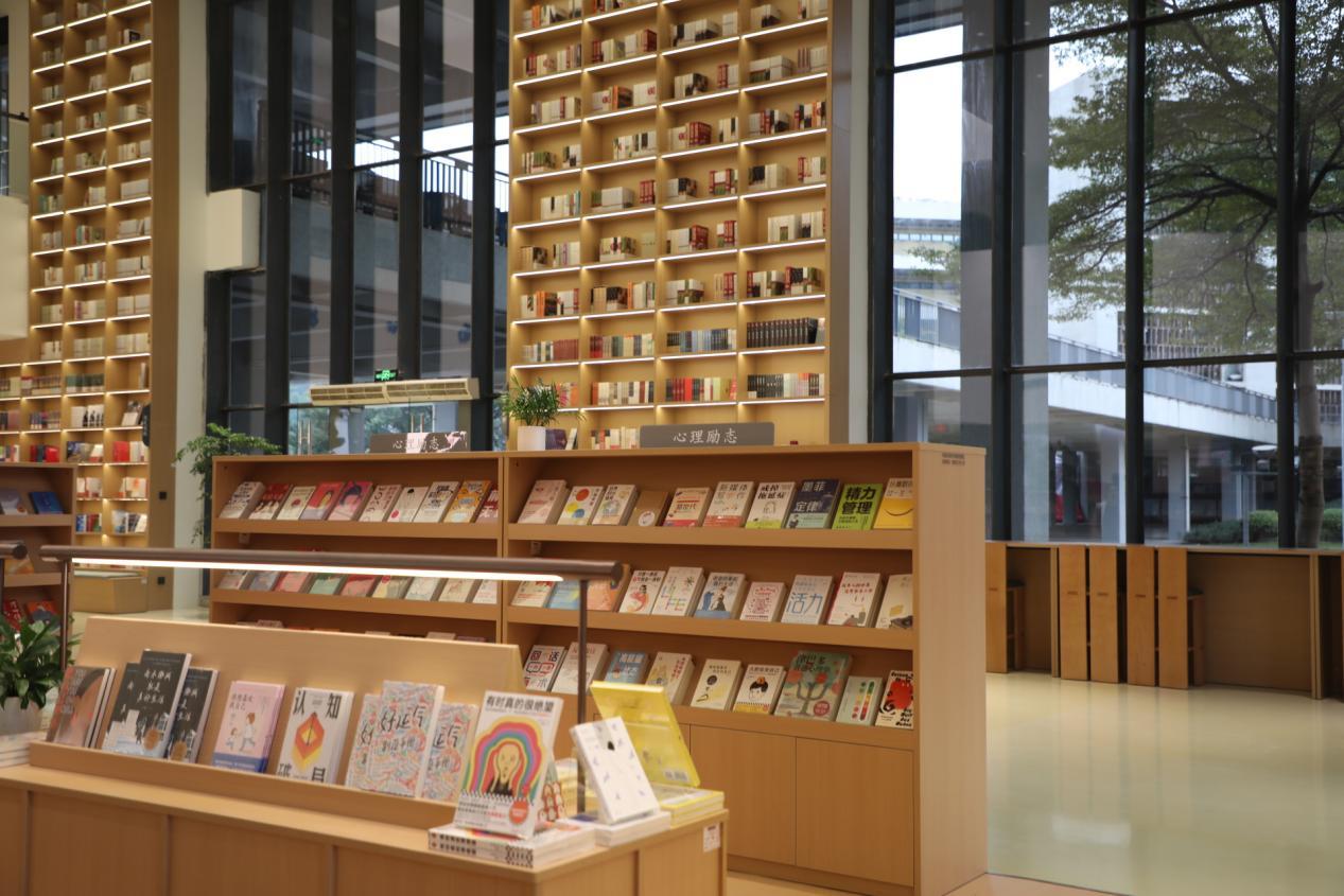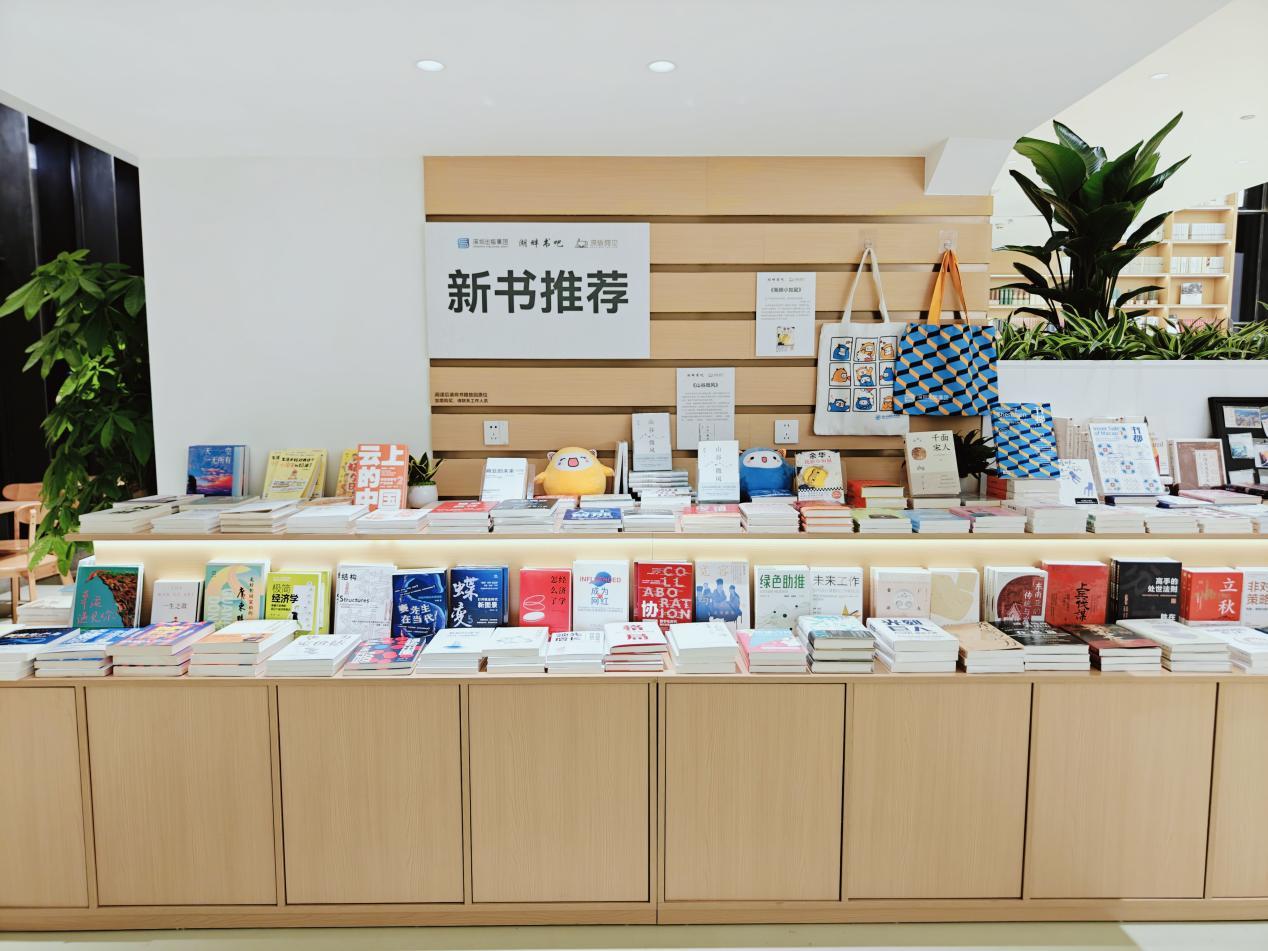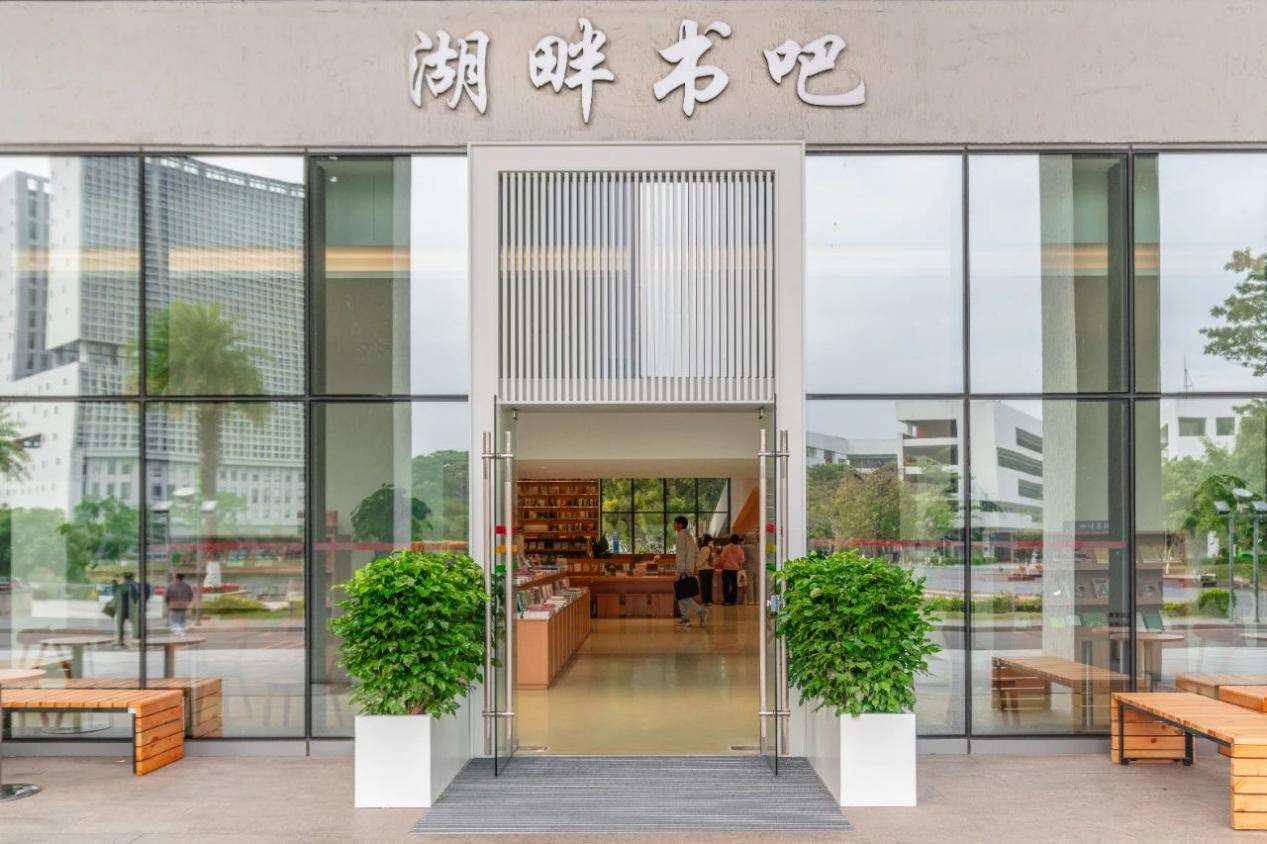 湖畔书吧坐落于深信院科技楼一层,由原一层大厅改造完成,室内面积855平方米,旨在打造一个集阅读学习、展示交流、文化生活等多功能于一体的校园综合性文化空间。书吧整体色调以浅色为主,搭配深灰色石材,浅色木地板与书柜,通过绿色植物的点缀,营造宁静而不失活力的空间氛围。书吧拥有图书及咖啡茶饮、简餐烘焙等零售新业态,整体布局包括开放阅读区、安静阅读区、文创展品区、吧台区及外摆区,配备约3500个品种10000册图书,图书品类涵盖党政类书籍、深圳系列及深圳出版社精品书籍、中外文学、历史文化、哲学社科、心理学、科技科普、艺术鉴赏等。