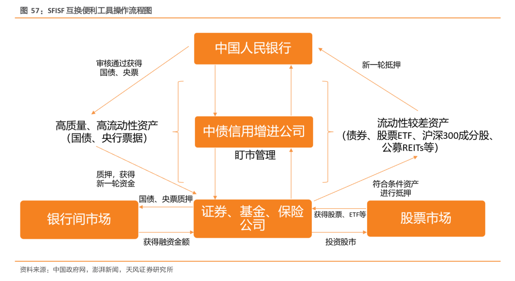潘功胜说,这项工作支持的是符合条件的证券、基金、保险公司,这些机构会由证监会、金融监管总局按照一定的规则来确定,可以使用他们持有的债券、股票ETF、沪深300成分股等资产作为抵押,从中央银行换入国债、央行票据等高流动性资产。国债、央行票据与市场机构手上持有的其他资产相比,在信用等级和流动性上是有很大差别的。很多机构手上有资产,但是在现在的情况下流动性比较差,通过与央行置换可以获得比较高质量、高流动性的资产,将会大幅提升相关机构的资金获取能力和股票增持能力。