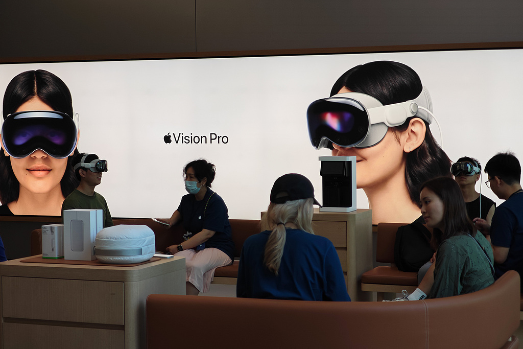 2024年7月22日,上海徐汇区一家苹果专卖店内,多位顾客正在试戴和了解Apple Vison Pro头显产品。视觉中国 资料图