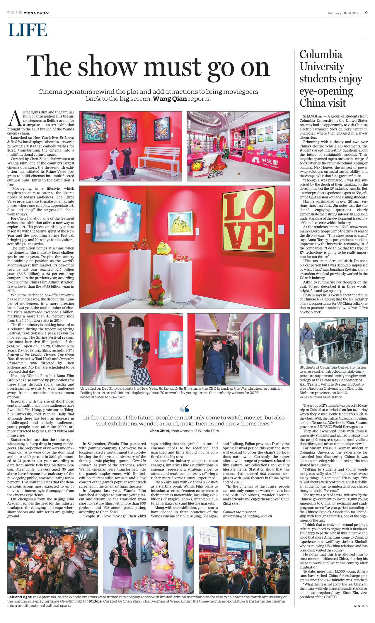 今年,万达电影还将不定期举办策展,给观众带来生动沉浸的文化体验。陈祉希介绍,万达电影还与各大片方、导演接洽,携手让美术服装道具走出银幕,来到线下进行展陈。此前1月初,在北京CBD万达影城,举办了主题为“BE LOVED & BE RICH”的艺术共创展,新锐艺术家歪歪、陈建周、张超级、任萌等共同参与。