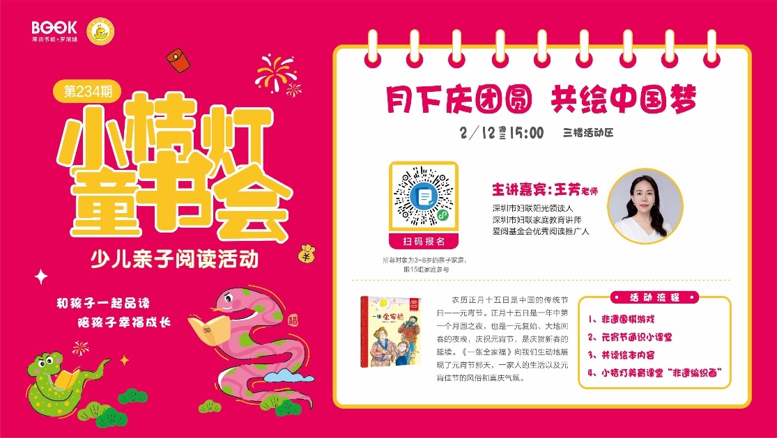 活动介绍:围绕绘本《一张全家福》与亲子家庭共读共赏。小朋友们通过绘本分享了解元宵节的由来与习俗,活动还将进行手工diy制作编织画,不仅能锻炼小朋友们的动手能力,更能帮助他们体会传统节日的独特魅力与家庭团圆的满满温馨。