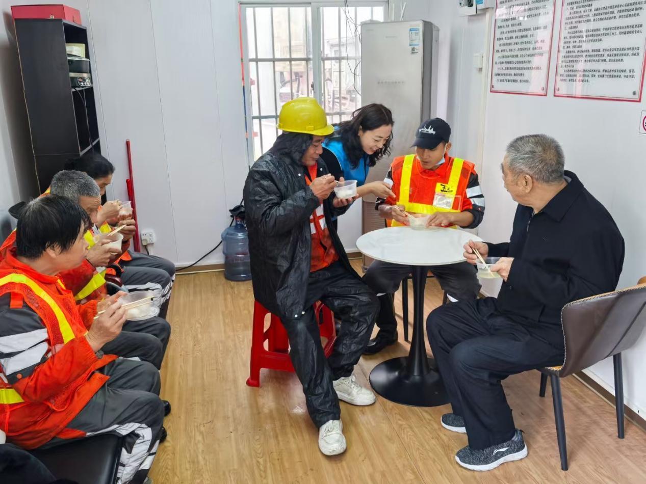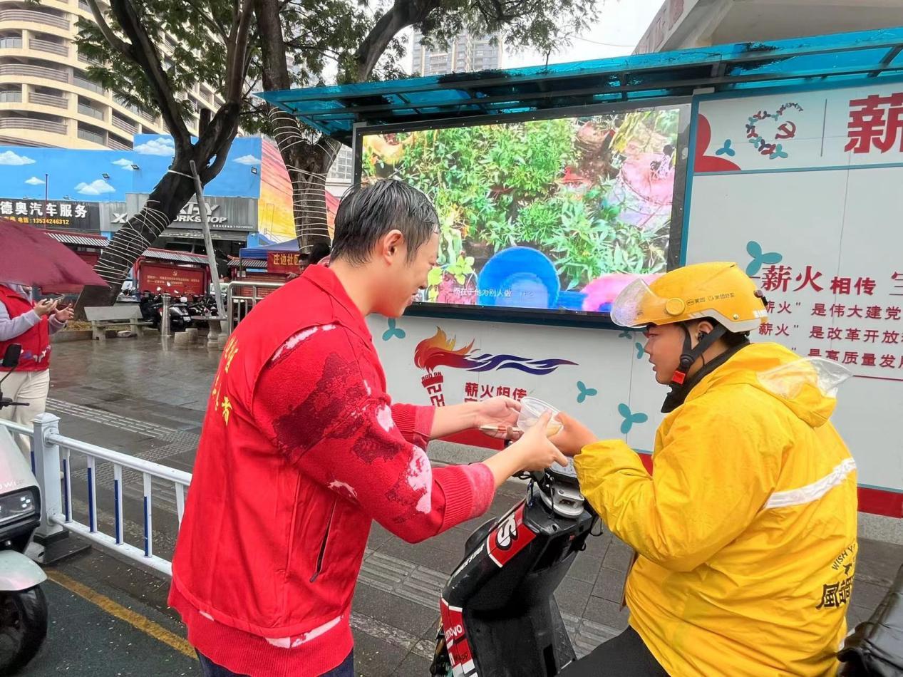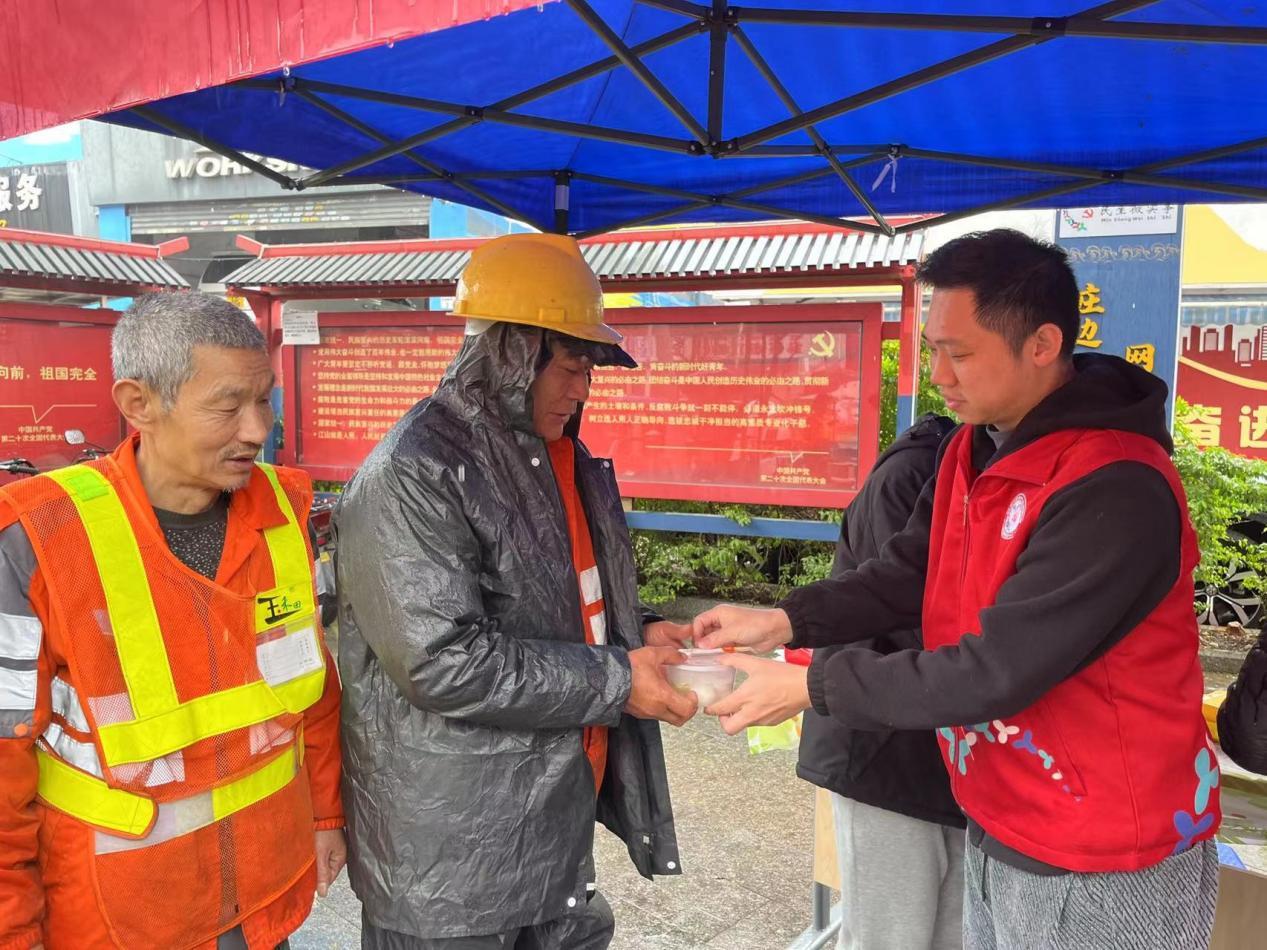 随着首批环卫工人结束早间作业抵达小站,党委领导带头将一碗碗热腾腾的汤圆递至劳动者手中,并致以诚挚问候。“元宵节还赶上下雨,没想到社区还惦记着我们!”环卫工人张大姐接过汤圆时感慨道。在薪火小站内,大家围坐一起品尝现煮的汤圆,香甜的滋味从舌尖蔓延至心间。同时,针对新业态群体"在路上"的工作特性,社工与志愿者分组行动,走上街头,为冒雨奔波的“城市骑士”们送去温暖,一碗碗热气腾腾的汤圆,不仅驱散了雨中的寒意,更传递了社区对他们的关心与敬意。