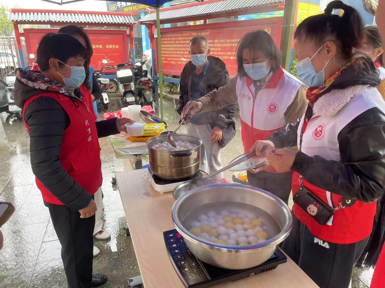 清晨的细雨未能阻挡社区传递温情的脚步。薪火小站旁,社区工作人员和志愿者早早的在细雨中完成帐篷搭建、桌椅布置等工作。活动现场架设起临时灶台,社工与志愿者们分工协作,煮汤圆、分装打包,忙碌中透着暖意。