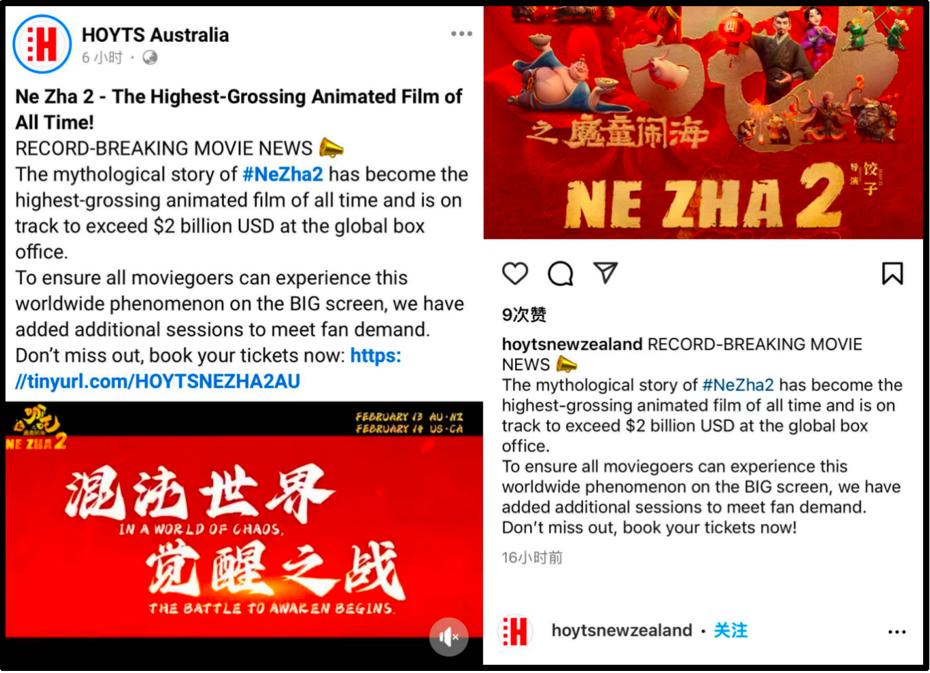 据悉,本次为新增排片,中澳成员迅速开会、敏捷执行。近期,万达电影管理层正赴澳对HOYTS做新财年考察。在和当地员工、影视从业者、影迷面对面交流中,管理层发现当地的“哪吒热情”,比国内已报道的更高。人们期待《哪吒2》的最终成绩、由此观看了更多华语电影,有位老奶奶甚至因为《哪吒2》,尝试在YouTube上自学中文。