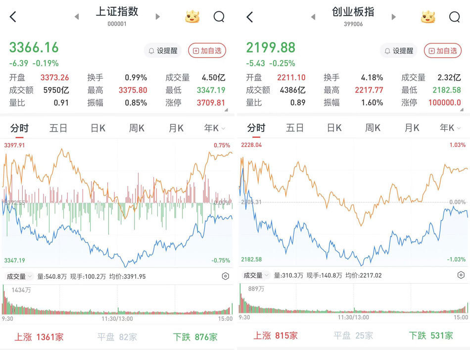 至收盘,上证综指跌0.19%,报3366.16点;科创50指数跌0.22%,报1105.16点;深证成指跌0.17%,报10825.7点;创业板指跌0.25%,报2199.88点。