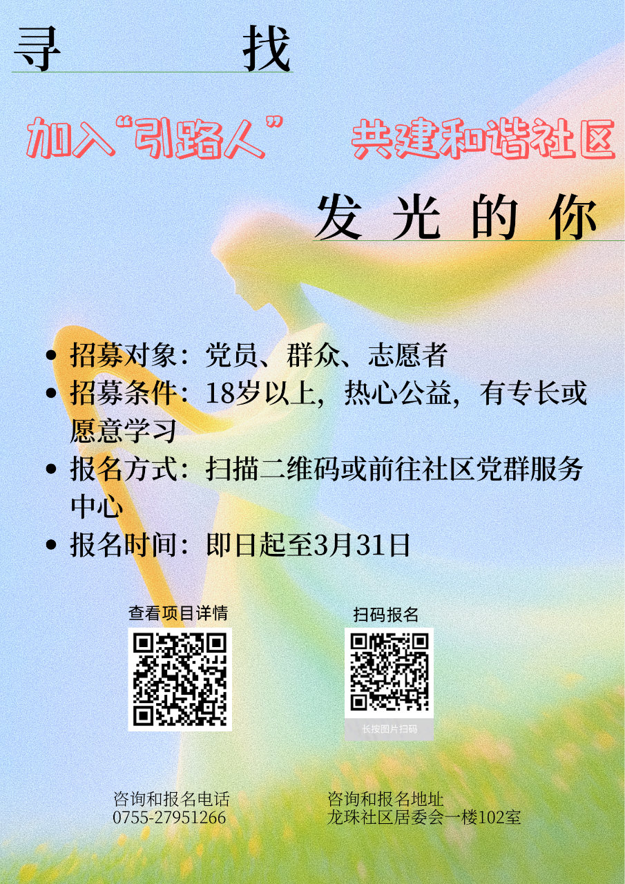 在西乡龙珠社区,一场“人人都能当主角”的社区共建行动拉开帷幕!今年三月,社区党委推出“引路人”培育计划,面向全体居民招募热心志愿者。无论你是擅长沟通的“邻里和事佬”,还是想学应急技能的“安全达人”,或是希望带娃更省心的家长,都能在这里找到成长空间,用行动为社区添砖加瓦。